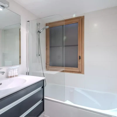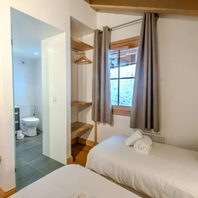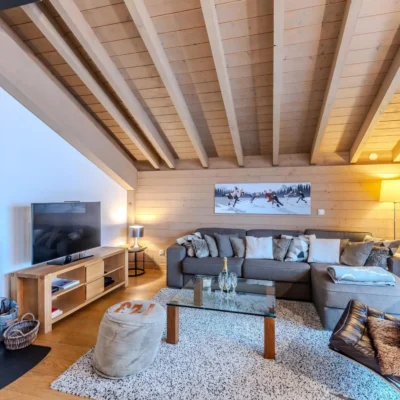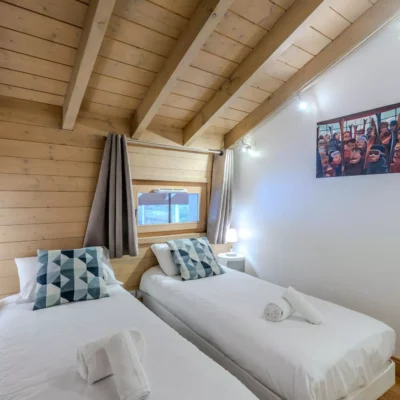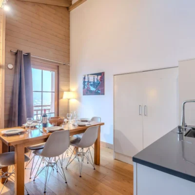 This mountain apartment stands out for its high ceilings and bright, airy atmosphere. It accommodates up to five guests, featuring a triple bedroom and a second room with either two single beds or a double bed. The cathedral-style living area, warmed by a wood stove, combines an open-plan lounge, dining space, and a kitchen with two counters. A south-facing balcony provides panoramic vistas of Morzine, the Pléney, and the Pointe de Nyon.