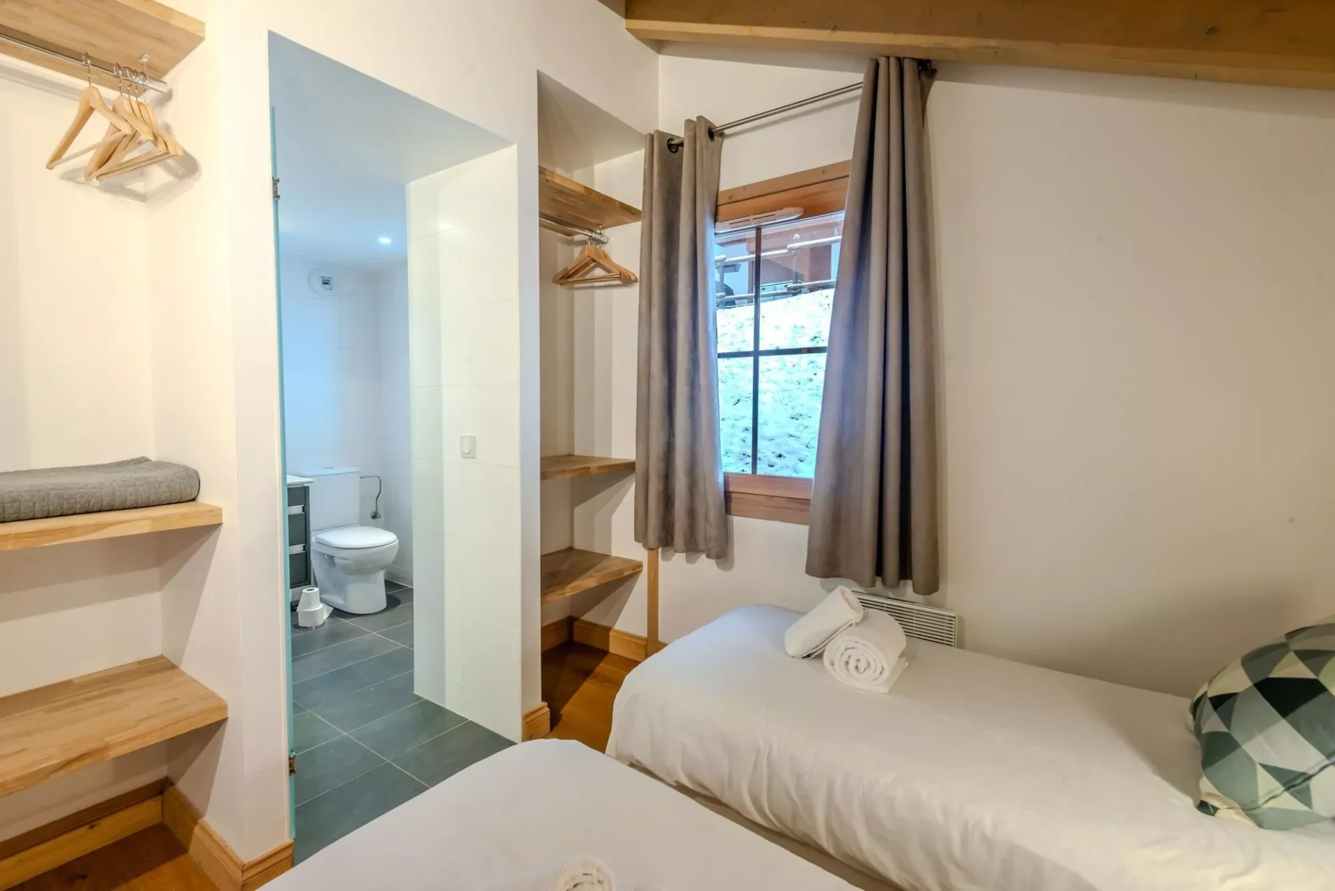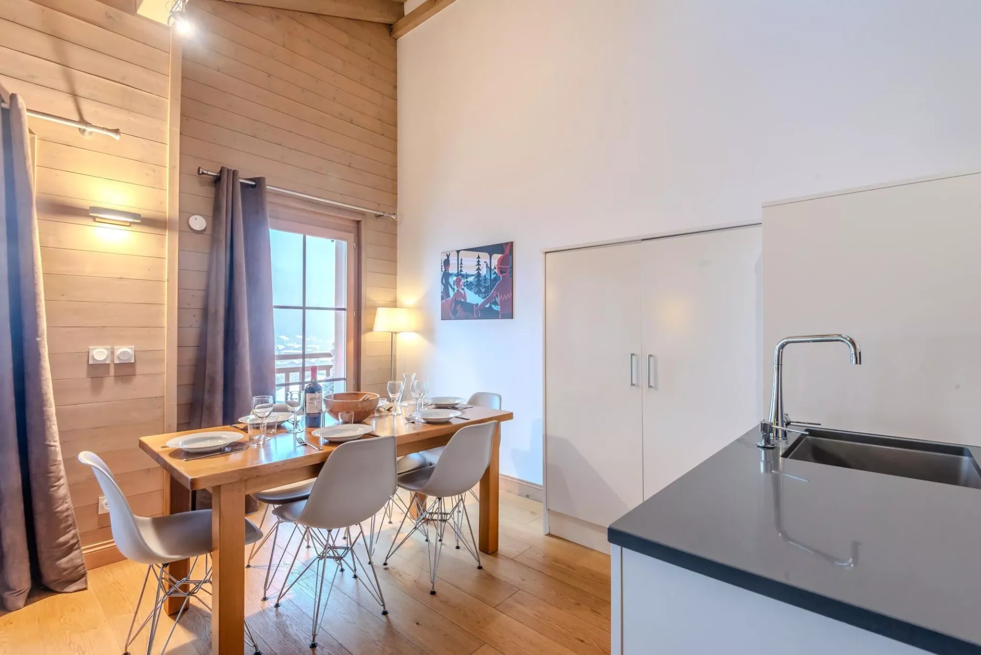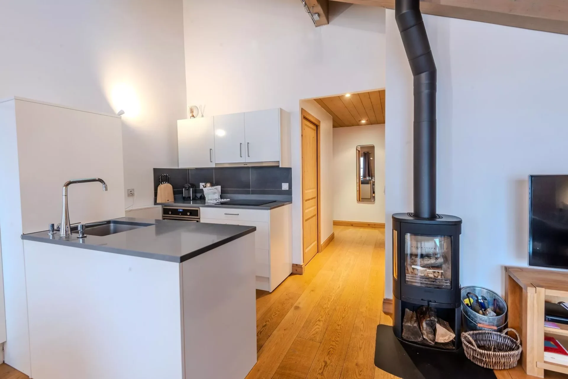 This mountain apartment stands out for its high ceilings and bright, airy atmosphere. It accommodates up to five guests, featuring a triple bedroom and a second room with either two single beds or a double bed. The cathedral-style living area, warmed by a wood stove, combines an open-plan lounge, dining space, and a kitchen with two counters. A south-facing balcony provides panoramic vistas of Morzine, the Pléney, and the Pointe de Nyon.