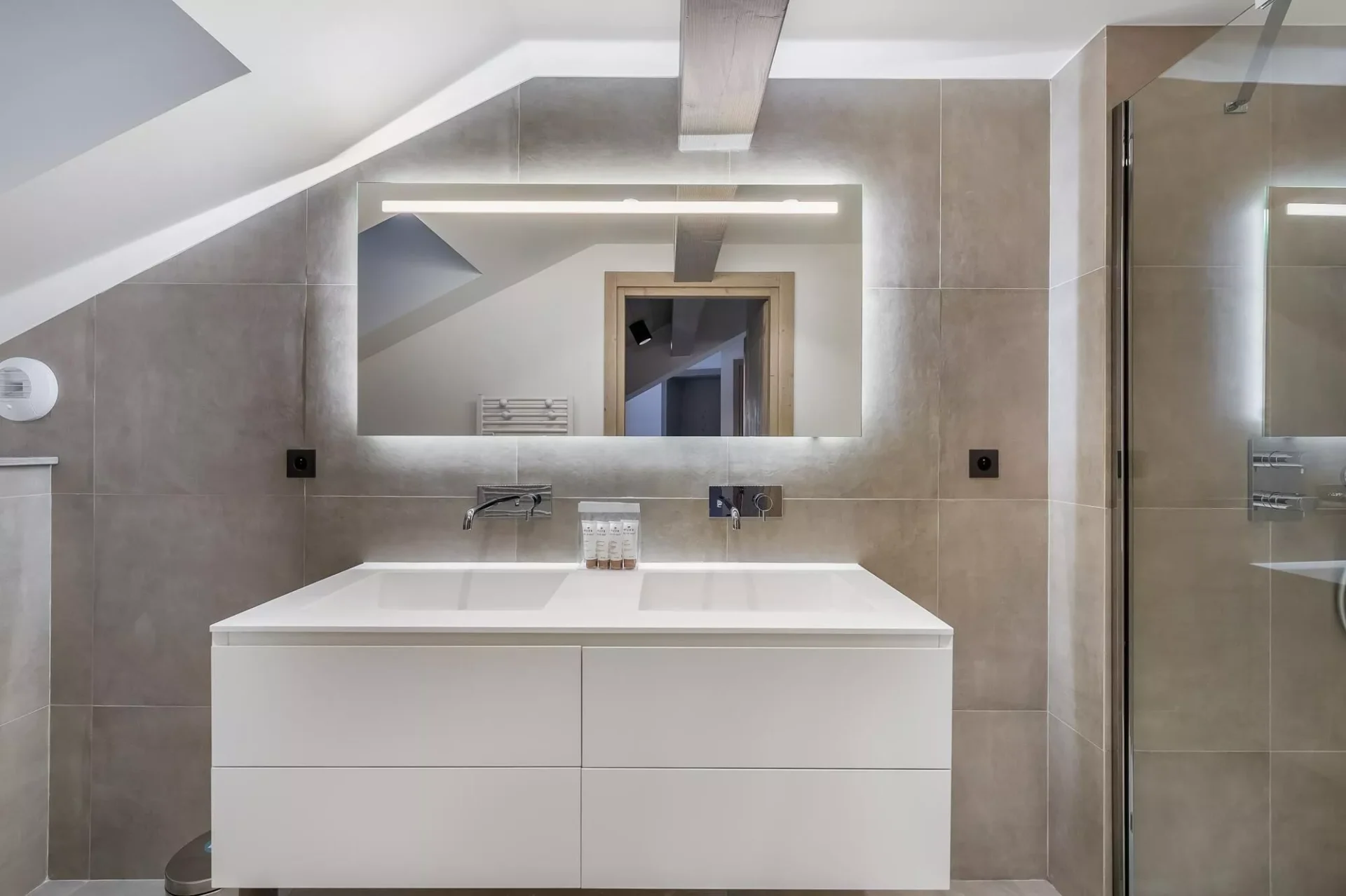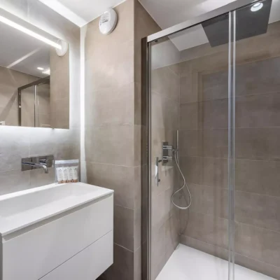 The apartment comprises four well-appointed bedrooms. The first bedroom has a double bed, TV, private balcony, and an en-suite bathroom. The second bedroom includes a double bed and TV. The third, tailored for children, offers bunk beds, a TV, and an en-suite shower room. The fourth bedroom features a double bed, TV, and an en-suite shower room with WC. In addition, there is a separate shower room and two independent WCs for extra convenience.