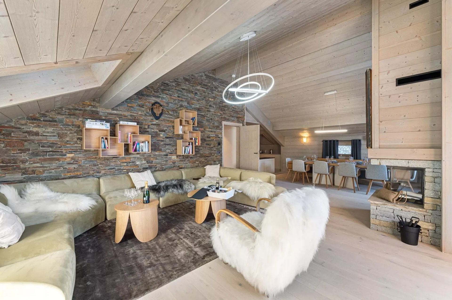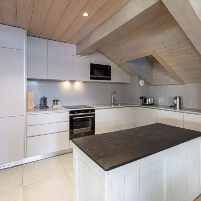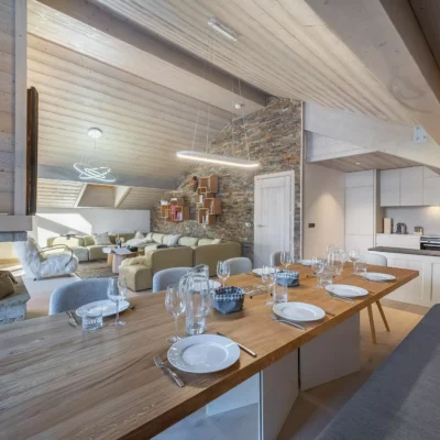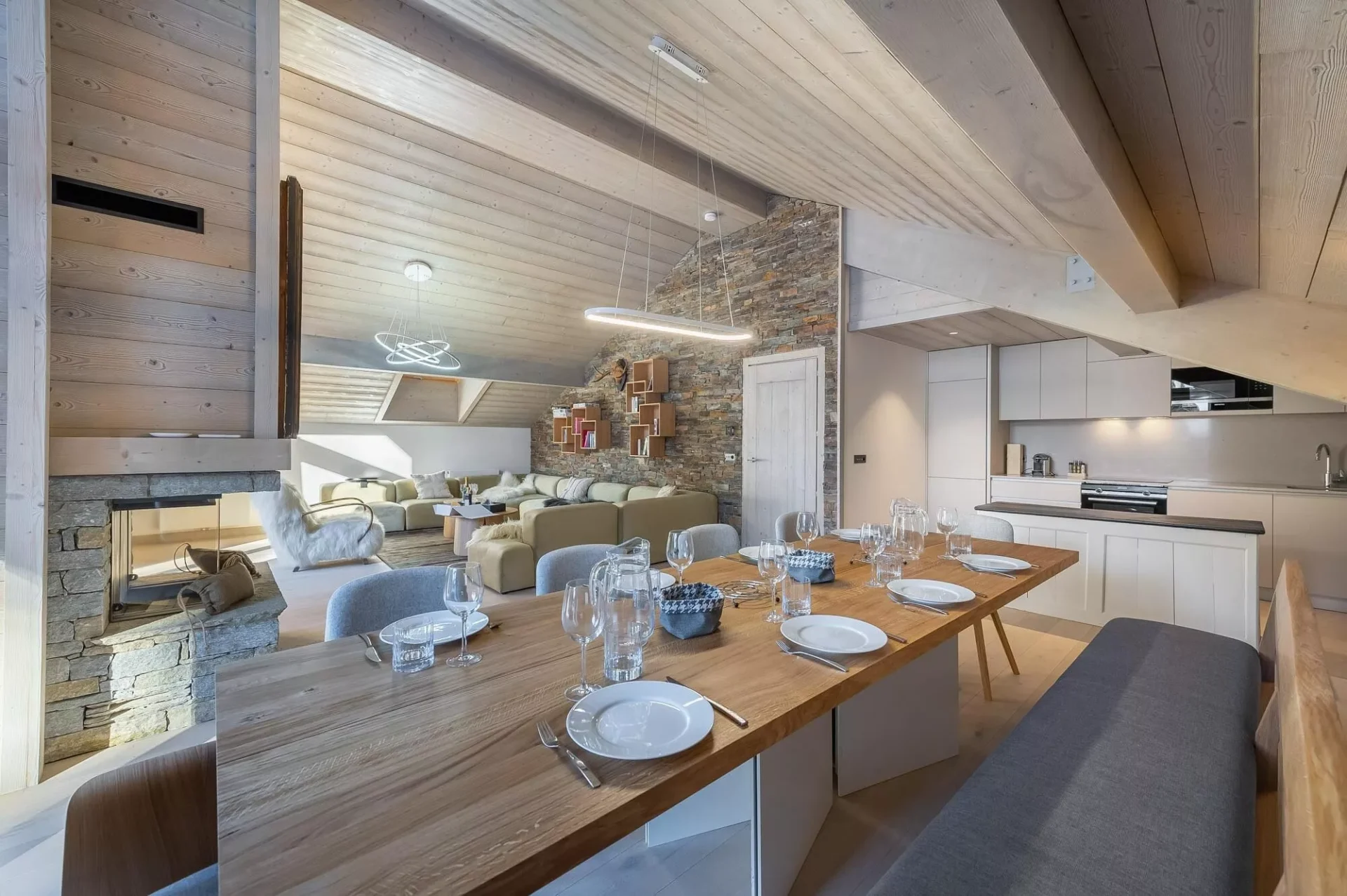 Spanning roughly 140 sq.m, the apartment offers a generous and inviting layout, accommodating up to six adults and three children. Its full south-facing orientation ensures the interior is bathed in natural light throughout the day. The spacious living area features a fireplace, TV, and a balcony that captures the sun, creating a bright and welcoming environment. The modern open-plan kitchen is fully equipped, designed to make meal preparation and shared dining both practical and enjoyable.