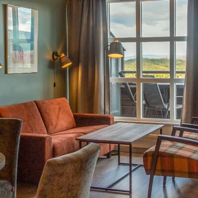 The lounge has large windows with snowy views and comfy sofas—perfect for relaxing after a day on the slopes. For added flexibility, you can upgrade to include breakfast or half board at the Radisson Blu Resort, where access to the pool is also available for an extra fee.