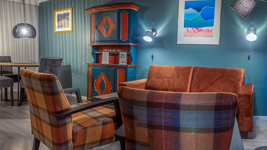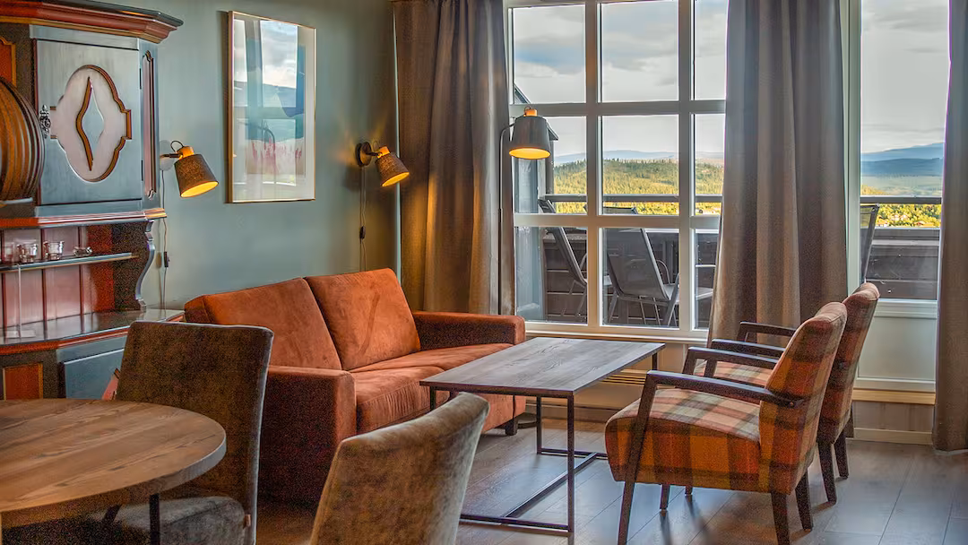 The lounge has large windows with snowy views and comfy sofas—perfect for relaxing after a day on the slopes. For added flexibility, you can upgrade to include breakfast or half board at the Radisson Blu Resort, where access to the pool is also available for an extra fee.